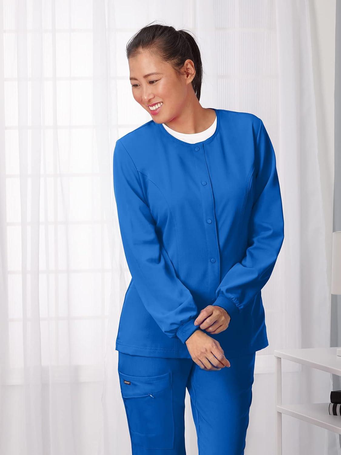 Snap to it in the Jockey Women's Classic Round Neckline Snap Scrub Jacket. A round neckline with color matching cap snap closure provides an updated look, while front and back princess seams offer a flattering fit with two top loading, roomy pockets, and a hidden media pocket. Soft, stretch color-matched knit cuffs help keep the sleeves in place for those on-the-go moments.